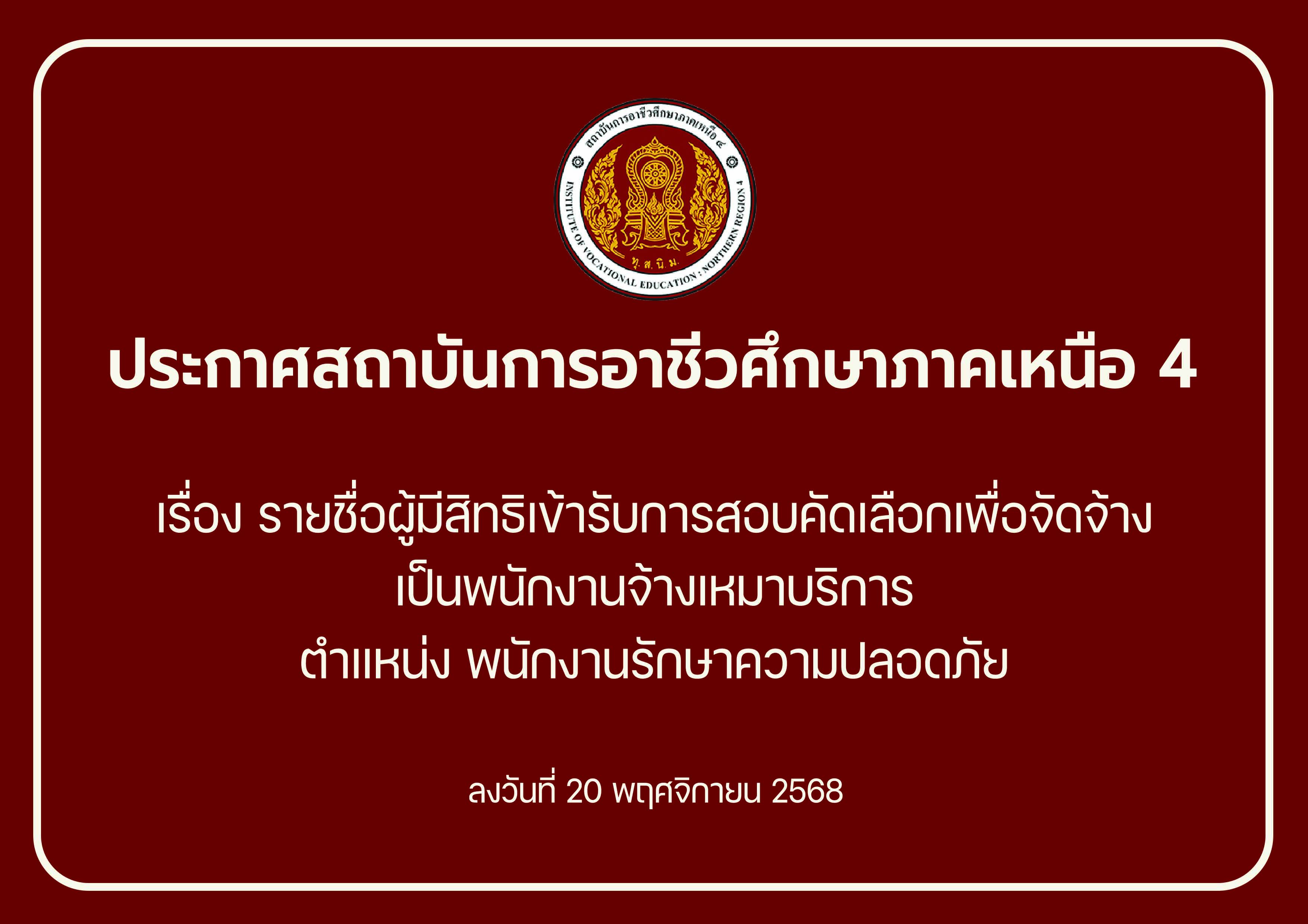 📢 ประกาศสถาบันฯ เรื่อง รายชื่อผู้มีสิทธิเข้ารับการสอบคัดเลือกเพื่อจัดจ้างเป็นพนักงานจ้างเหมาบริการ ตำแหน่ง พนักงานรักษาความปลอดภัย