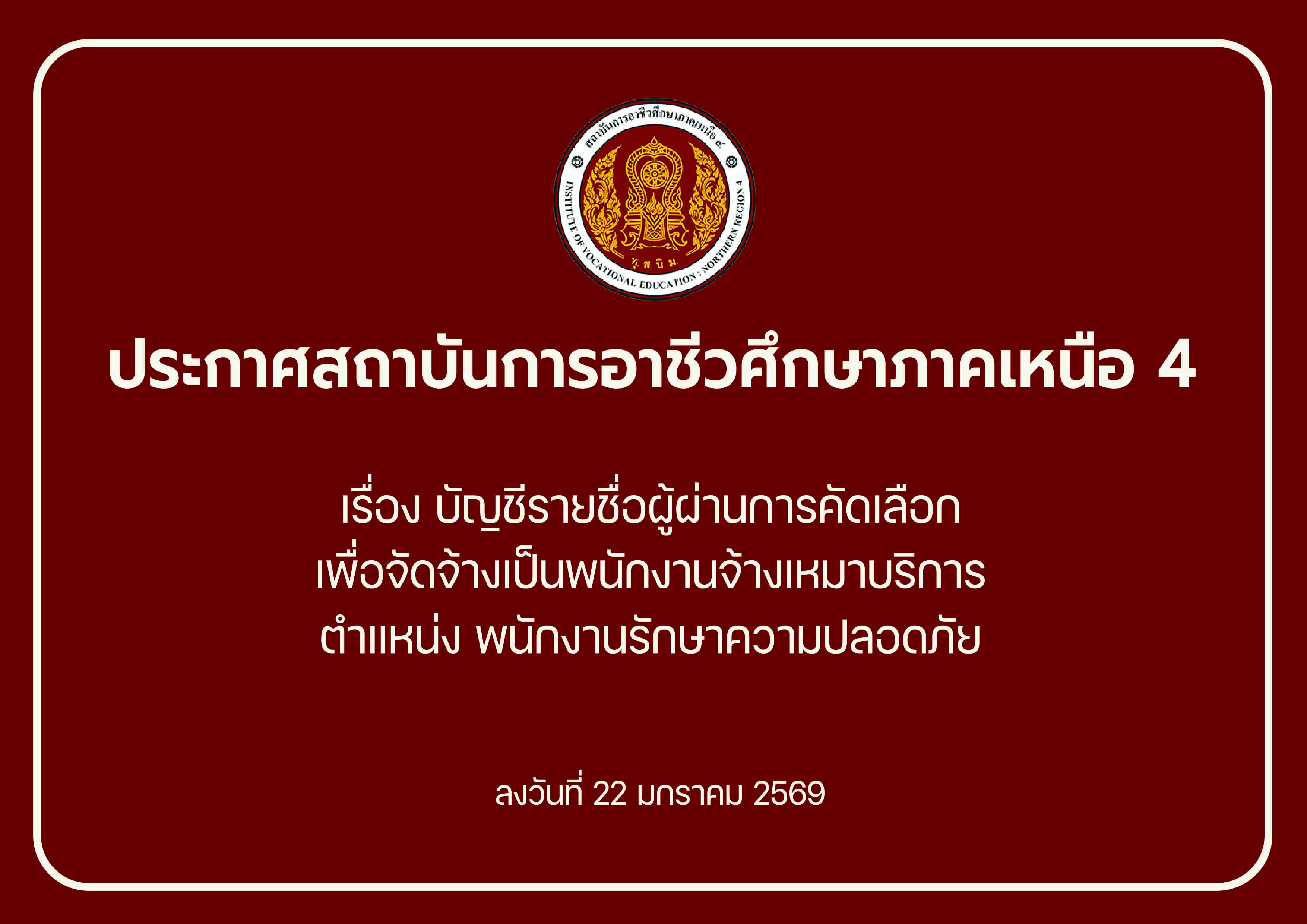 📢 ประกาศสถาบันฯ เรื่อง บัญชีรายชื่อผู้ผ่านการคัดเลือกเพื่อจัดจ้างเป็นพนักงานจ้างเหมาบริการ ตำแหน่ง พนักงานรักษาความปลอดภัย